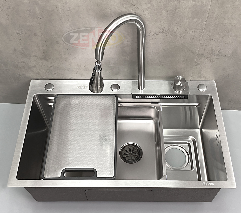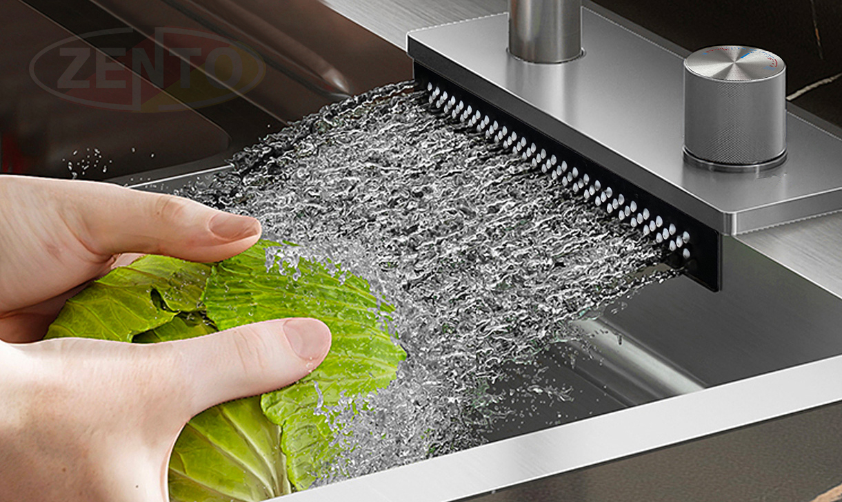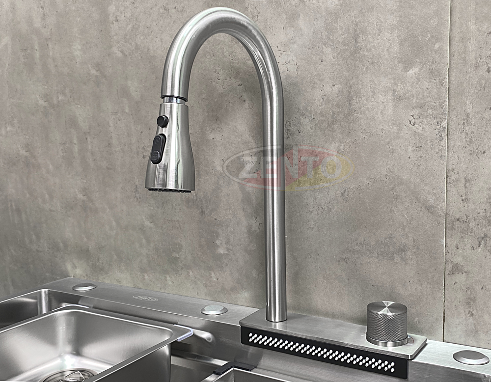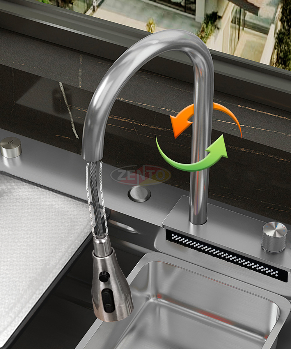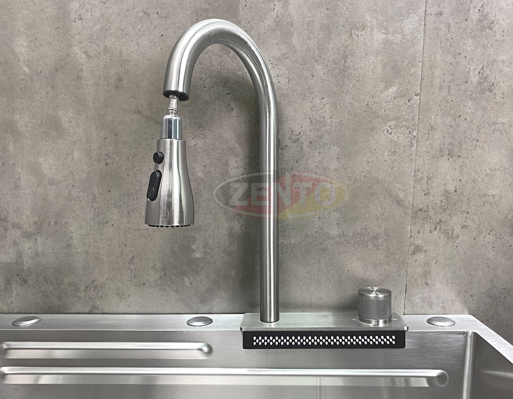 Chậu rửa có thiết kế với vòi rửa chén bát nóng lạnh Pull-Down Spray & Waterfall 4 chế độ.