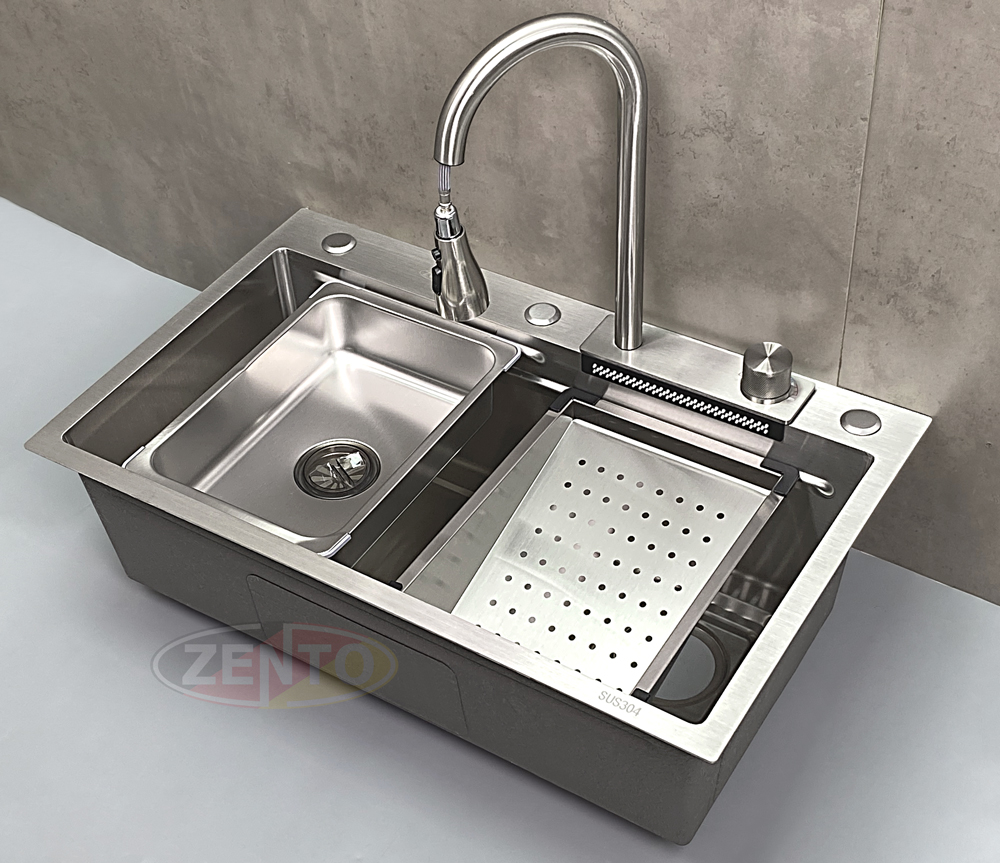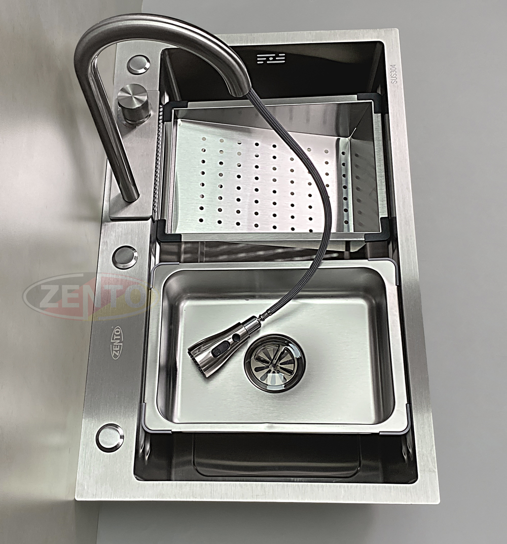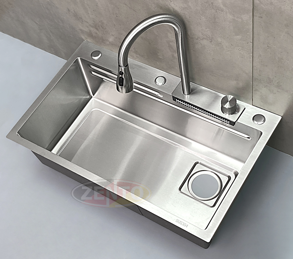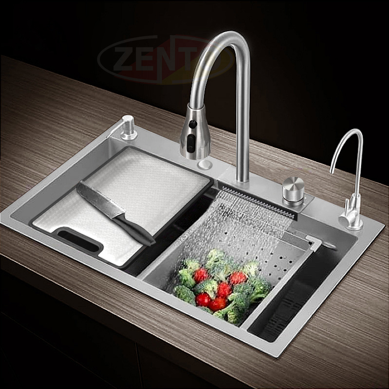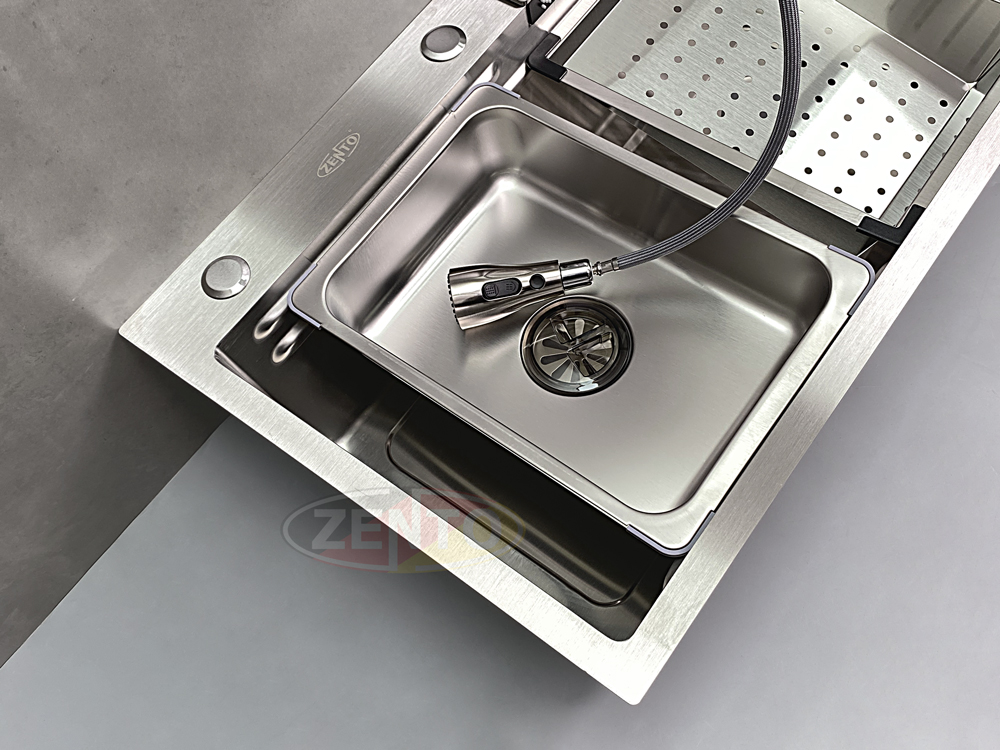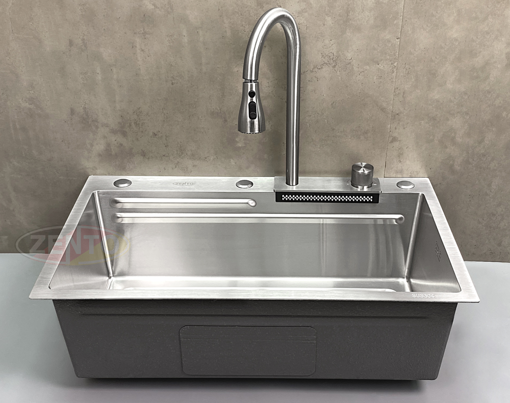 Chậu rửa có thiết kế với vòi rửa chén bát nóng lạnh Pull-Down Spray & Waterfall 4 chế độ.