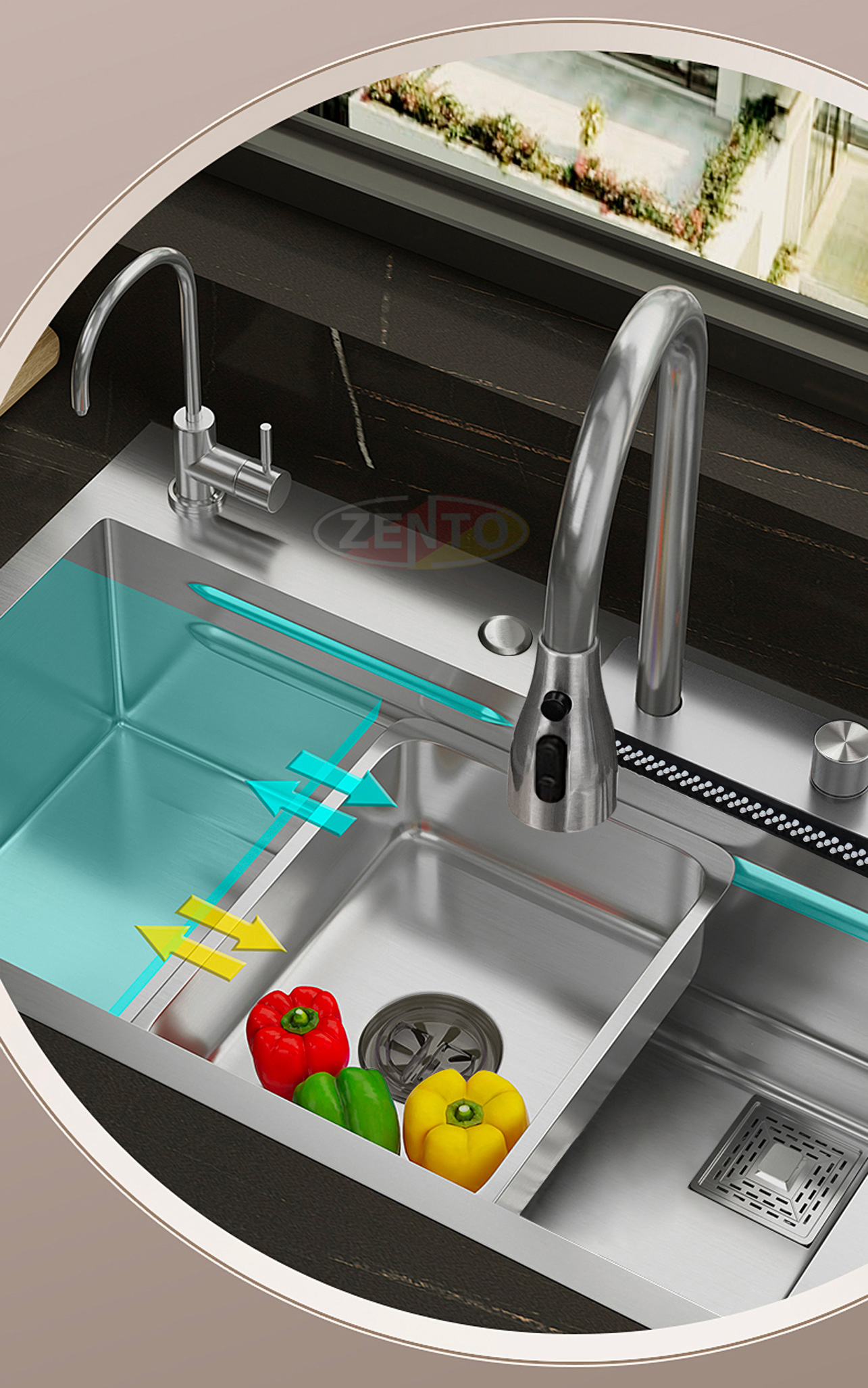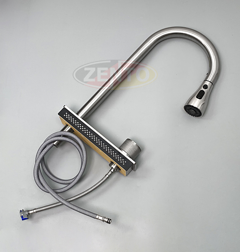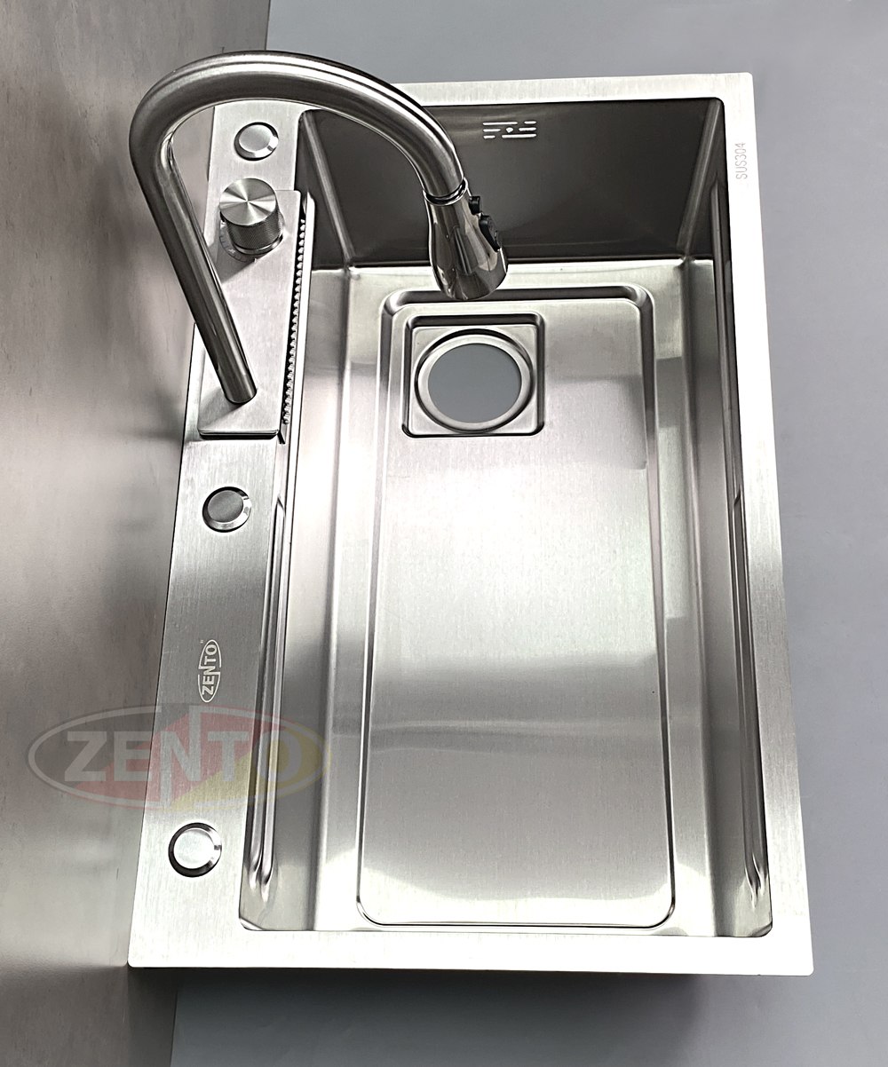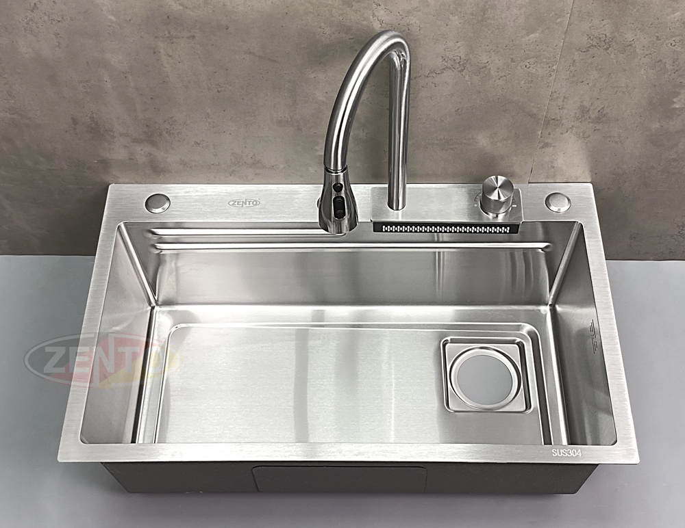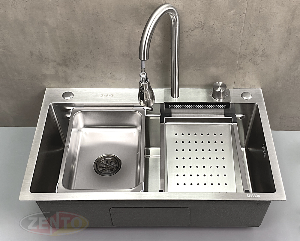 Chậu rửa có thiết kế với vòi rửa chén bát nóng lạnh Pull-Down Spray & Waterfall 4 chế độ.