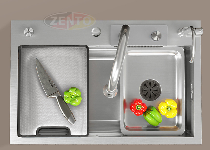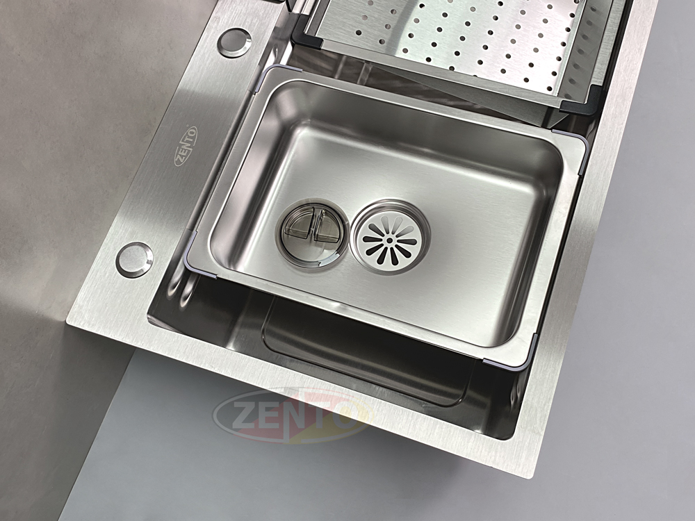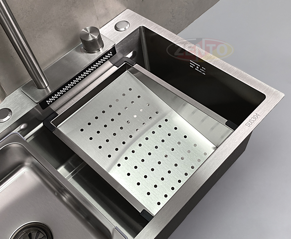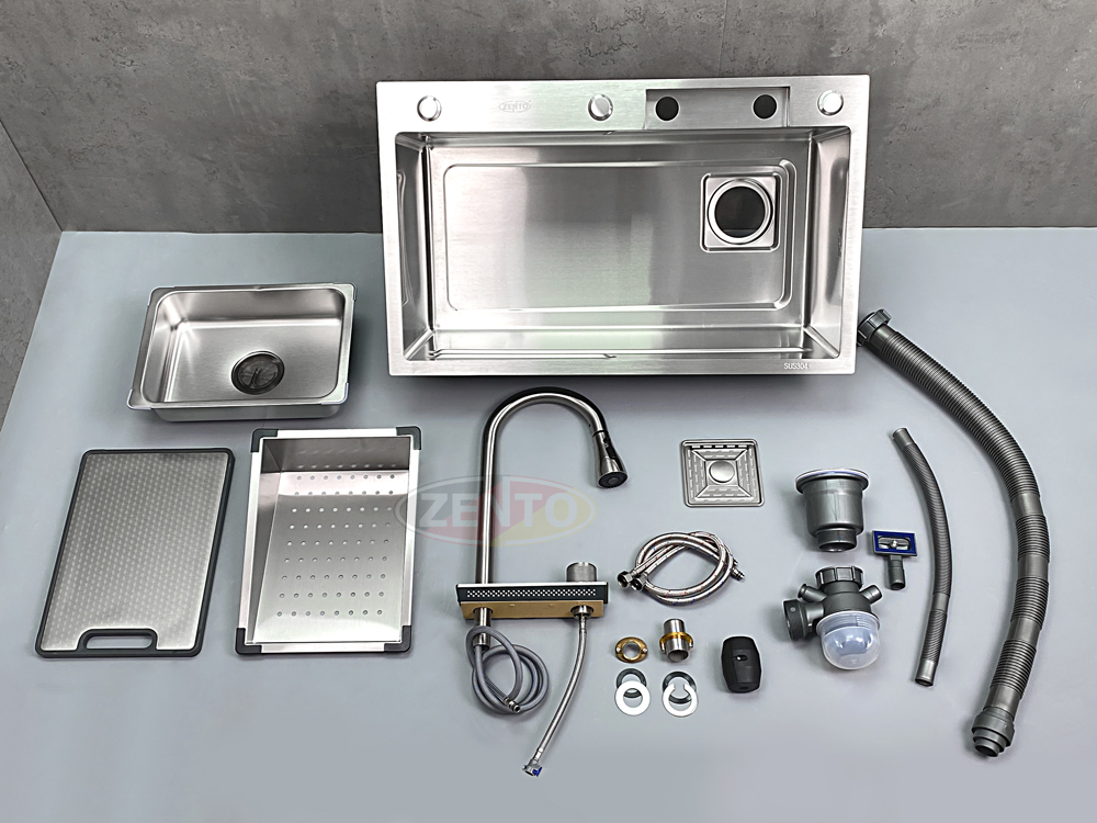 Sản phẩm kèm thêm rổ thoát nước, chậu nhỏ, thớt với thiết kế hiện đại cùng chất liệu thép không gỉ, đa năng & dễ dàng vệ sinh.