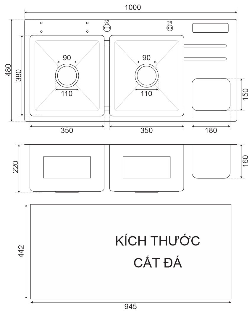 - Lưu ý: bộ sản phẩm không kèm theo giá rửa rau củ, vòi rửa bát & bình đựng nước rửa chén.