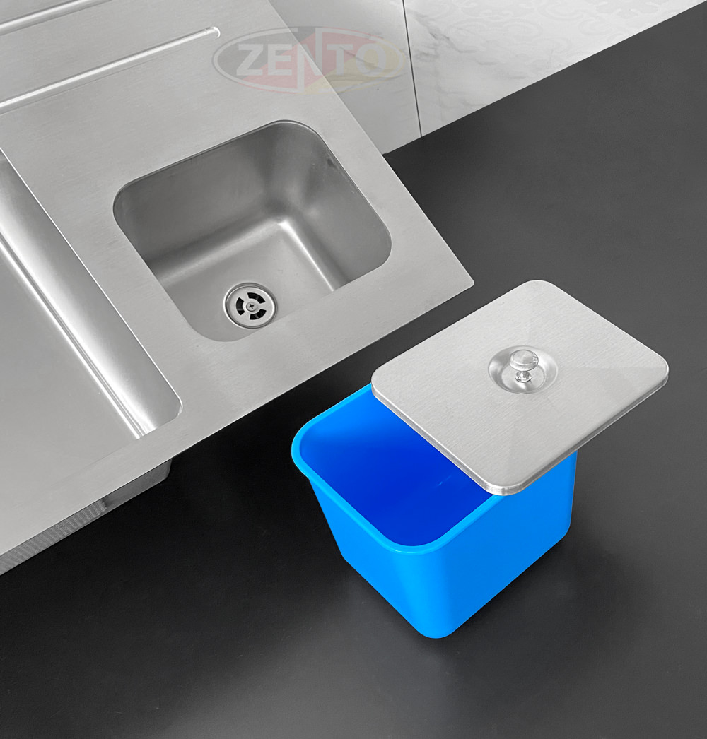 Hố đựng rác khá lớn có xi phông & ống xả nước thải cùng hộp nhựa và nắp đậy cực kỳ tiện lợi khi sử dụng.