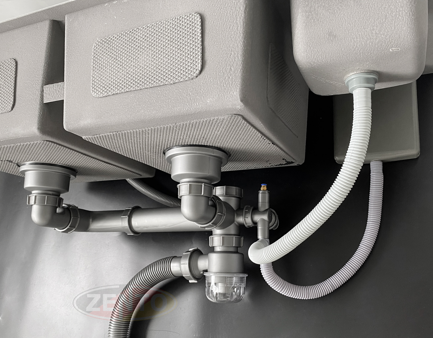 Có thể điều chỉnh khoảng cách để bộ xi phông áp sát tường. Phần chân bầu xả có thể linh hoạt lắp bên phải hay trái giúp tăng diện tích sử dụng của tủ bếp.