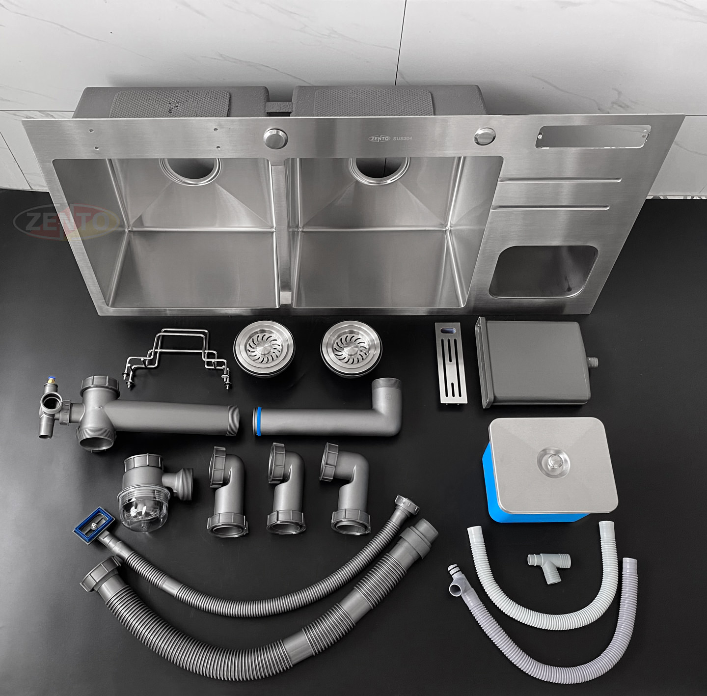 Bộ sản phẩm gồm: 1 chậu rửa bát & 1 Bộ xi phông, ống xả + hộp rác + hộp cài dao, giá để thớt.
